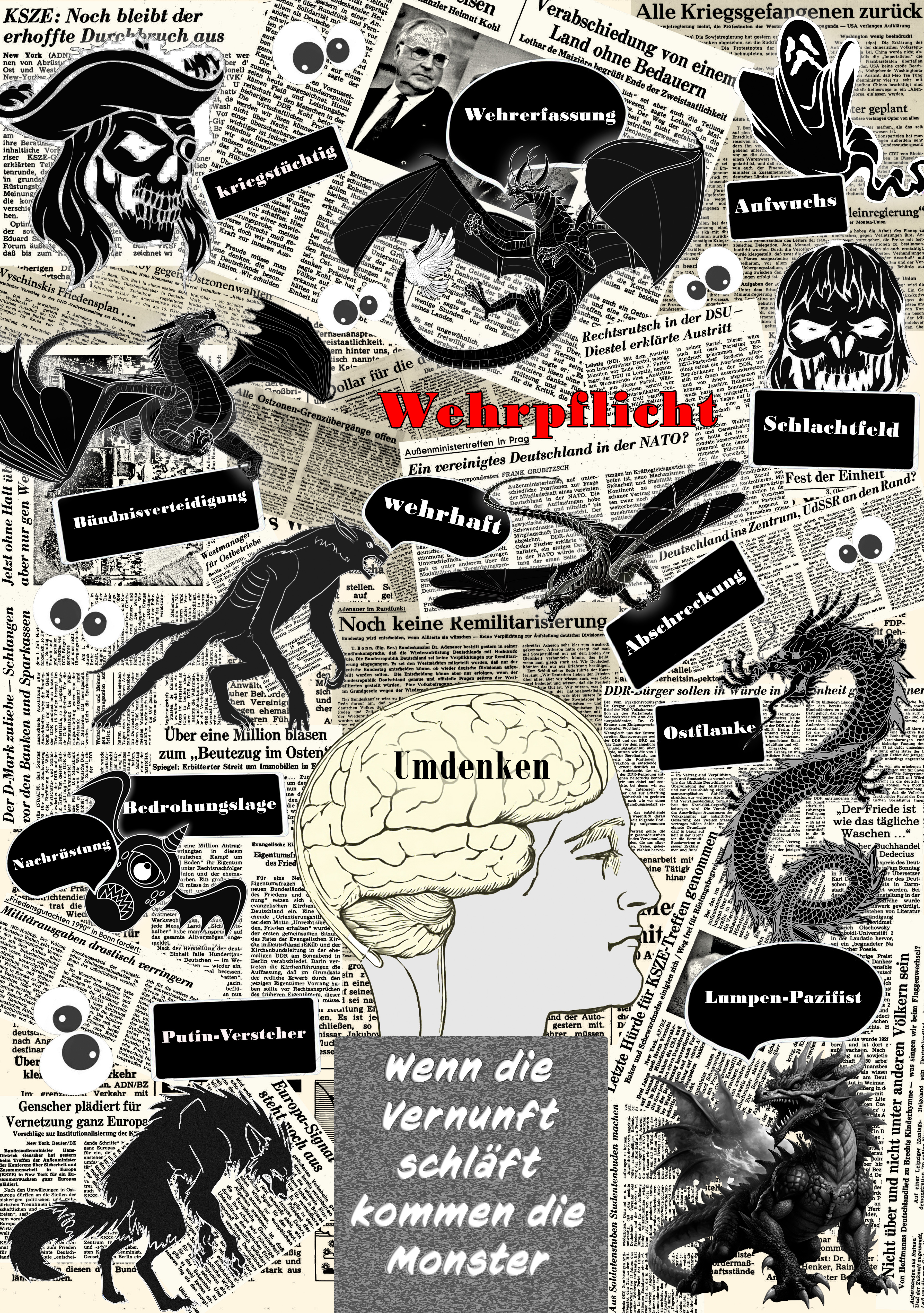 Daniela Dahns Buch „Der Schlaf der Vernunft“ über Kriegsklima, Nazis und Fakes hat mich zu diesem Bild inspiriert. Die Autorin nimmt Bezug auf ein Werk von Francisco de Goya mit dem Titel „El sueño de la razón produce monstruos“ (dt. Der Schlaf der Vernunft erzeugt Ungeheuer), das auf die dunklen Seiten der menschlichen Seele und der Gesellschaft hinweist, wenn Vernunft und kritisches Denken der Irrationalität weichen. In Anlehnung daran habe ich Monster in das Bild montiert und ihnen Schlagworte aus der aktuellen Debatte über Aufrüstung, geprägt von der mittlerweile allgegenwärtigen Kriegsrhetorik, zugeordnet. Den Hintergrund bilden historische Zeitungsausschnitte aus den Jahren 1950 und 1989/90. Das Ganze gipfelt in dem von den Mobilmachern geforderten Umdenken und als Folge in der Wiedereinführung der Wehrpflicht.